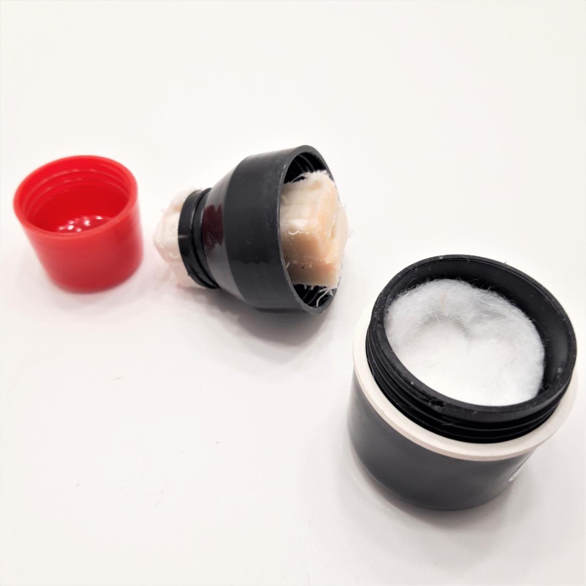 Pequeño frasco de plástico con capacidad para aproximadamente 30 ml de aceite de camelia y provisto de una almohadilla aplicadora para distribuir el aceite de manera homogénea y rápida sobre sus herramientas con el fin de protegerlas de la corrosión. Evita el consumo excesivo de aceite.