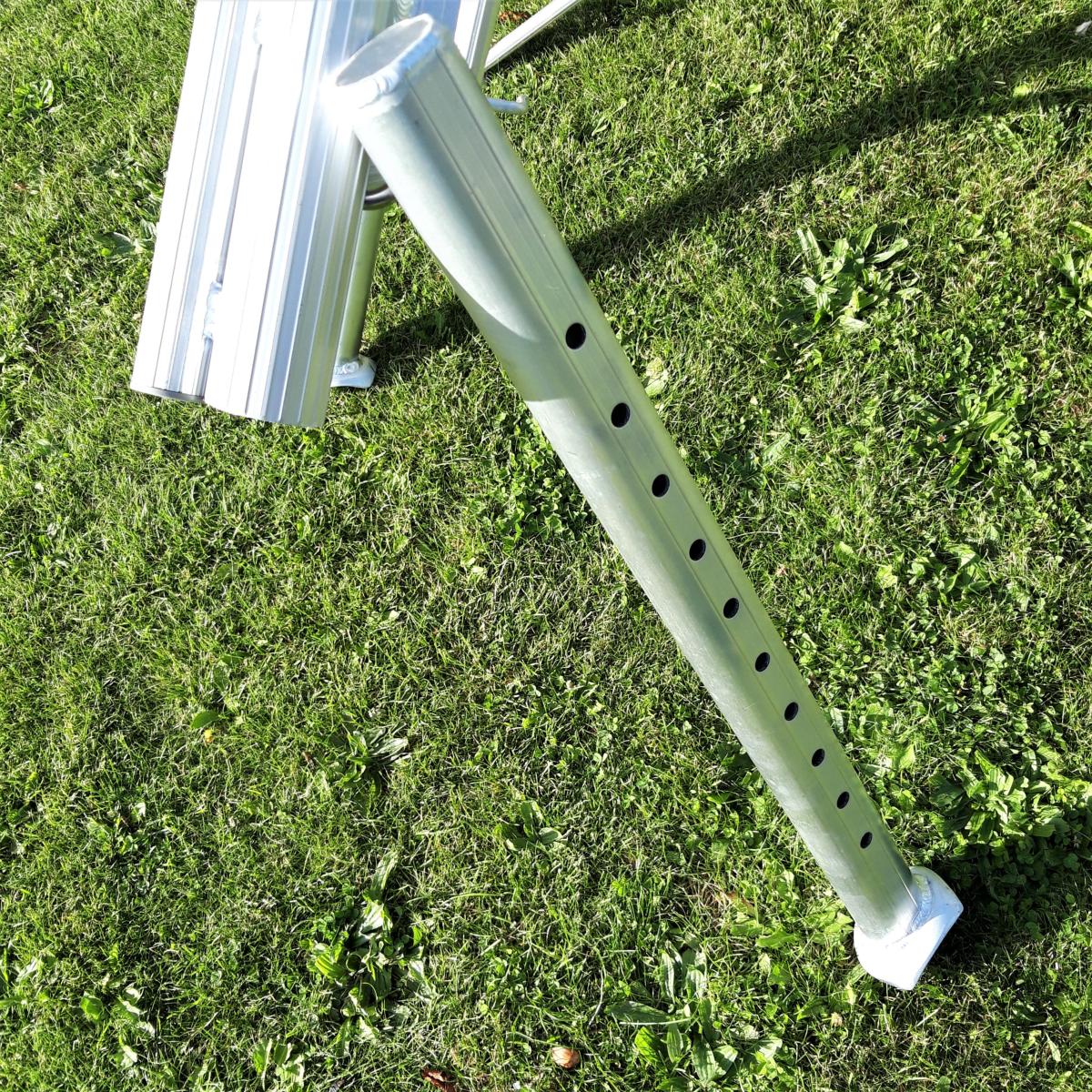 Las 2 patas delanteras son regulables en 10 posiciones, ajustables de 5 cm en 5 cm para garantizar la horizontalidad de los peldaños en todas las posiciones con respecto a la pendiente.