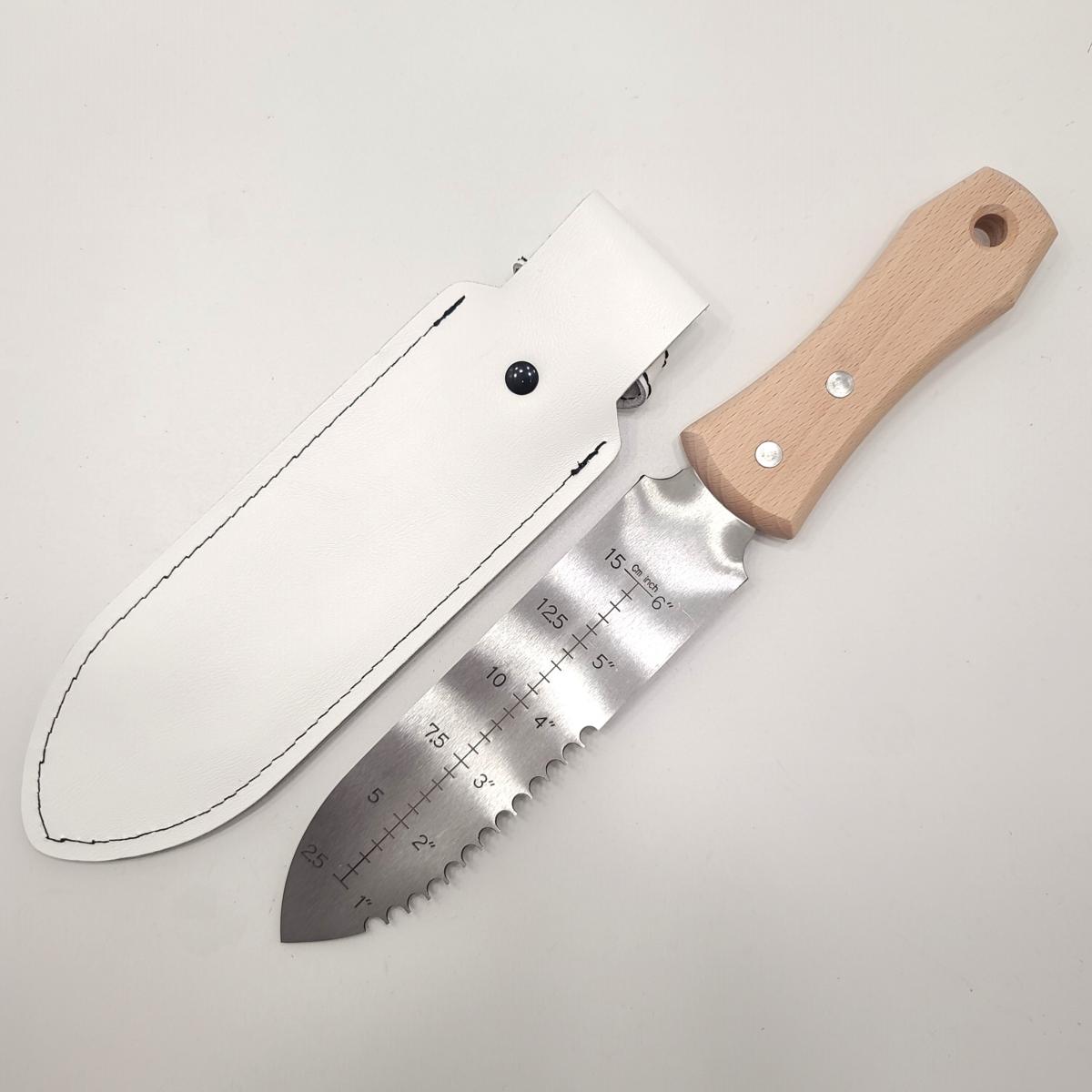 Se trata de un cuchillo sencillo con filo japonés que se convierte en gubia o cuchillo para desherbar, y es excelente como trasplantador para macetas pequeñas o bulbos... La hoja es ligeramente cóncava, lo que permite recoger un poco de material (tierra, arena, mortero...).