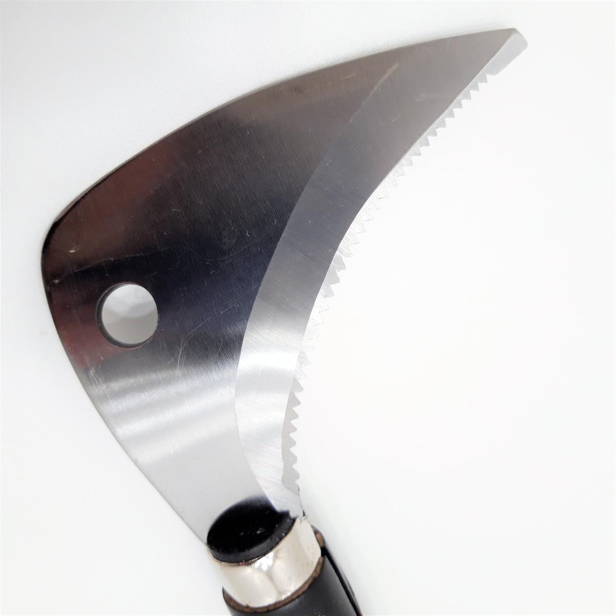 La hoja curva de acero inoxidable está provista de dientes de sierra, lo que permite acabar con las raíces más densas. El movimiento es similar al de serrar con una sierra de corte tirante y al de cortar con una hoz.