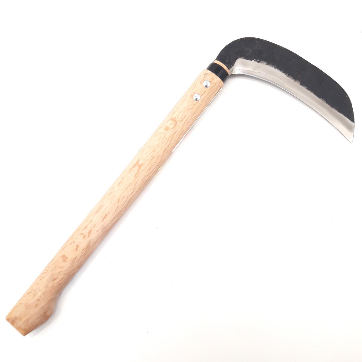 La hoja gruesa y de doble filo de 165 mm está muy ligeramente curvada para diestros, pero el doble bisel permite un uso ambidiestro (las hoces para zurdos son muy difíciles de encontrar).