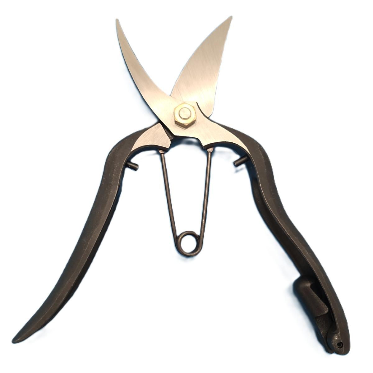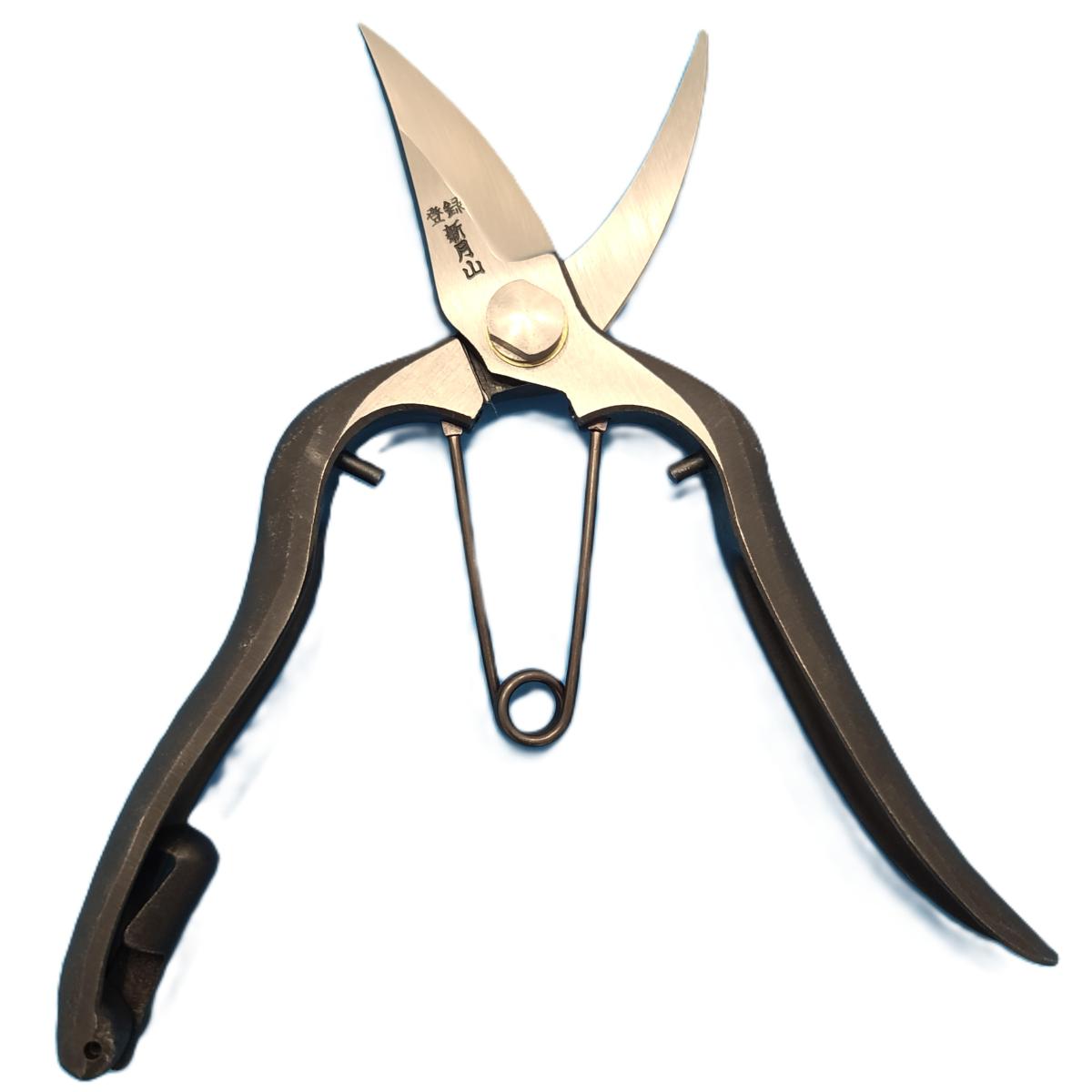 Tijeras de podar japonesas tradicionales de acero al carbono de la marca SHINGASAN, muy ligeras y resistentes. Ángulo B. Longitud 185 mm para manos estándar (también disponibles en versiones de 185 y 225 mm).