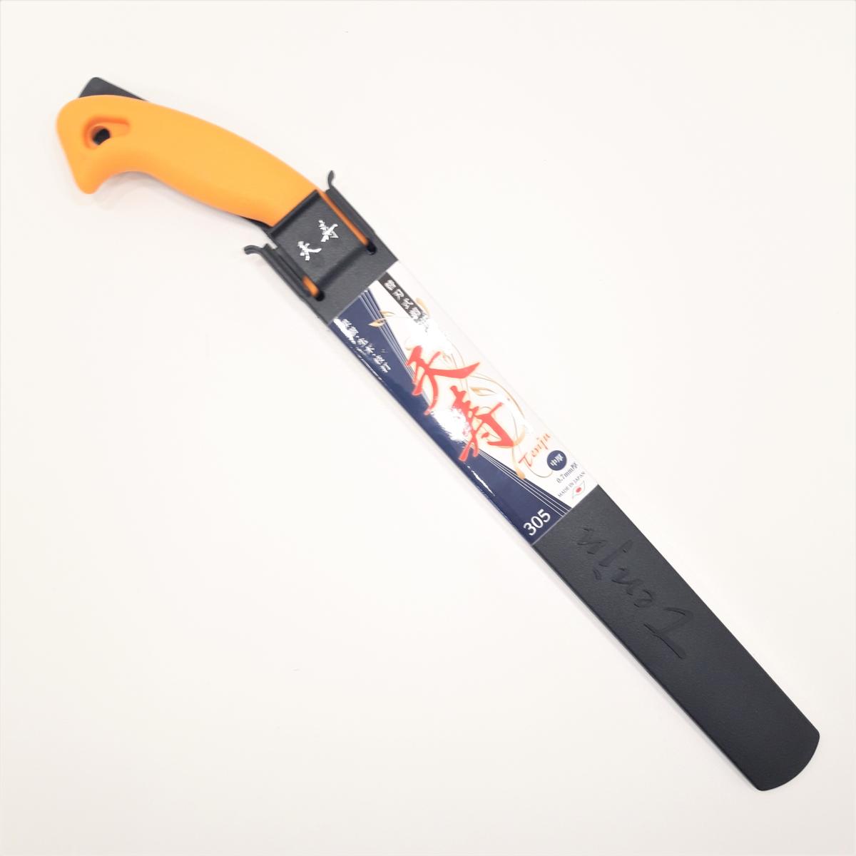 Funda de plástico negro de 37 cm abierta en la parte inferior y ventilada por orificios en la parte trasera para la evacuación del agua y los residuos, con pasador para cinturón de 6,5 cm de altura y pasador para mosquetón. La sierra se bloquea en la funda mediante un sistema de mordazas de plástico en la parte superior de la funda, que sujetan el mango como un tornillo de banco.