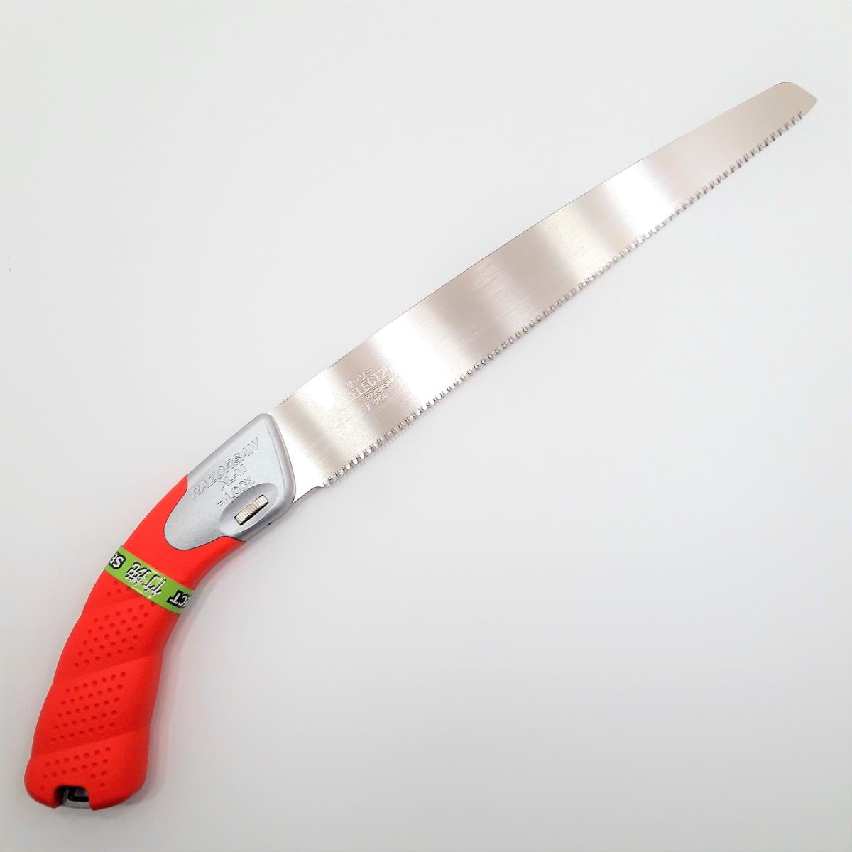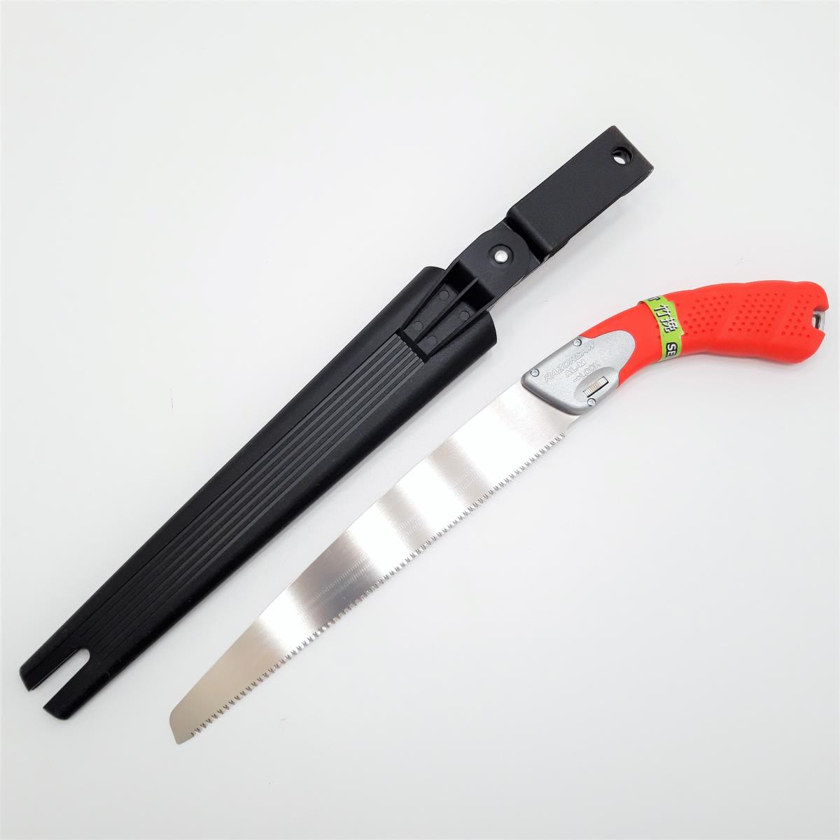Sierra japonesa profesional con funda sintética provista de un dispositivo de seguridad.