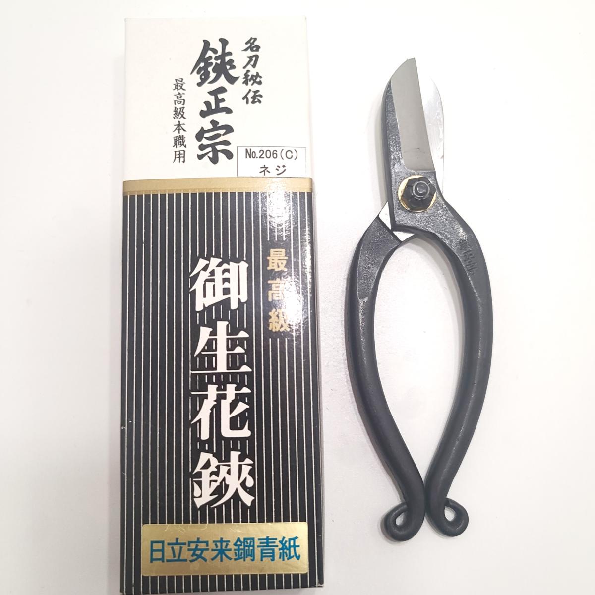 Tijeras japonesas tradicionales para ikebana fabricadas en acero Aogami con alto contenido en carbono de la marca MASAMUNE, de una ligereza y resistencia incomparables.